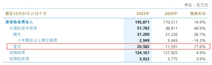 从业务结构看,新华保险的趸交业务增长凶猛。该公司长期保险首年保费收入为577.82亿元,较2024年同期的388.11亿元增加189.71亿元,同比增长48.88%。其中,期交业务保费收入为372亿元,同比增长36.7%;趸交业务保费收入为205.82亿元,增速高达77.6%。