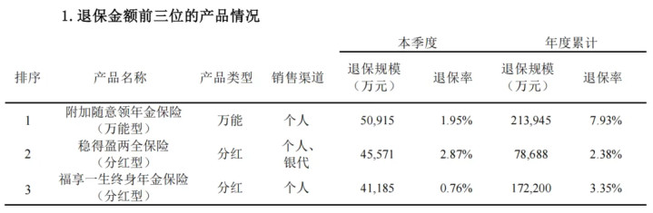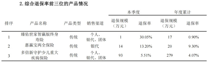 新华保险仅上述三款产品2025年的累计退保规模合计就高达46.48亿元。此外,该公司另一款产品2025年第四季度的退保率超过30%,但当期退保规模仅为1万元,该产品名称为“臻佑世家”智赢版终身寿险,产品类型为传统险,销售渠道为个险、银保、团险渠道。
