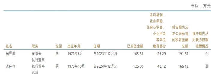 偿付能力报告披露,新华保险2025年度共有6名高管、2名董事的薪酬超过100万元。年报显示,该公司董事长杨某成2025年的税前报酬总额为191.84万元,该公司总裁龚某峰2025年的税前报酬总额为166.12万元。