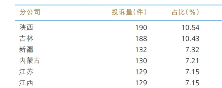从投诉类型看,新华保险2025年的退保投诉量占比为54.35%,销售投诉量占比为37.77%。从投诉地区分布看,新华保险陕西分公司2025年以190件投诉排名第一,其次为吉林分公司、新疆分公司,投诉量分别为188件、132件。